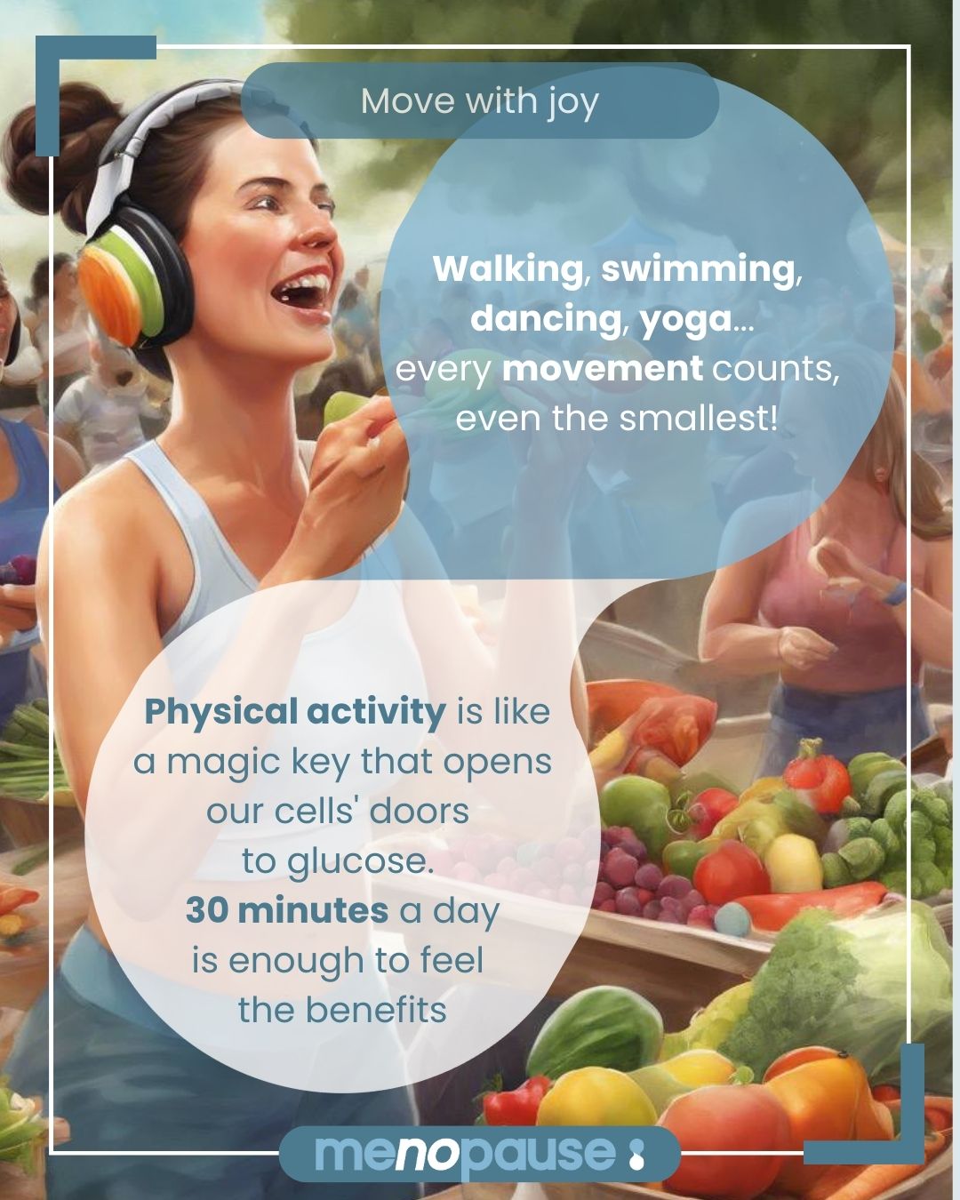 💃 Move with joy: walking, swimming, dancing, yoga… every movement counts, even the smallest! Physical activity is like a magic key that opens our cells’ doors to glucose. 30 minutes a day is enough to feel the benefits ✨
